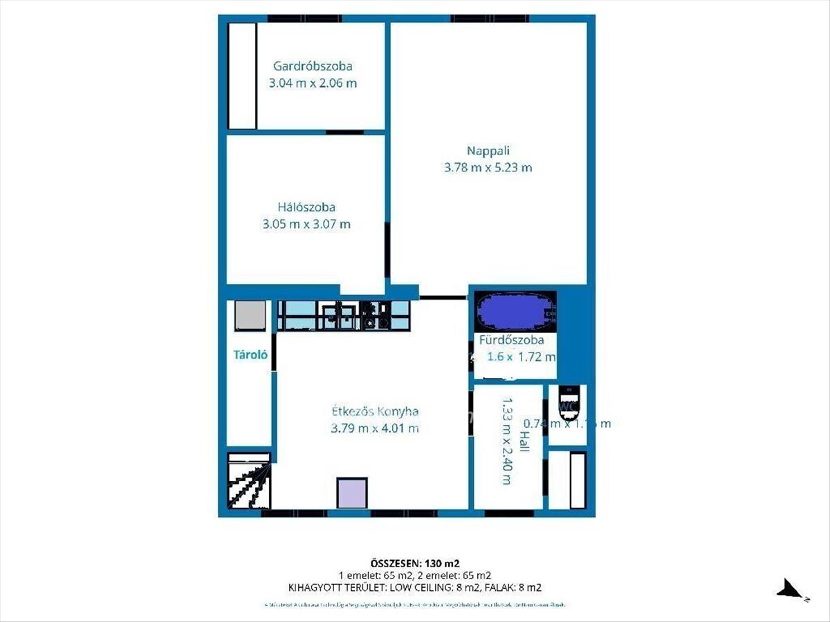 Öt különálló szoba, nappali, dolgozószoba, tágas konyha étkezővel, kamra, két fürdőszoba és külön wc áll rendelkezésre. a felső szint teljes értékű belmagassággal használható, a lakás nagy része frissen felújított állapotú. Az alsó szinten található vizes blokk és előtér felújítása az új tulajdonos elképzelései szerint alakítható, így nem kell kompromisszumot kötni a belső kialakítás során.