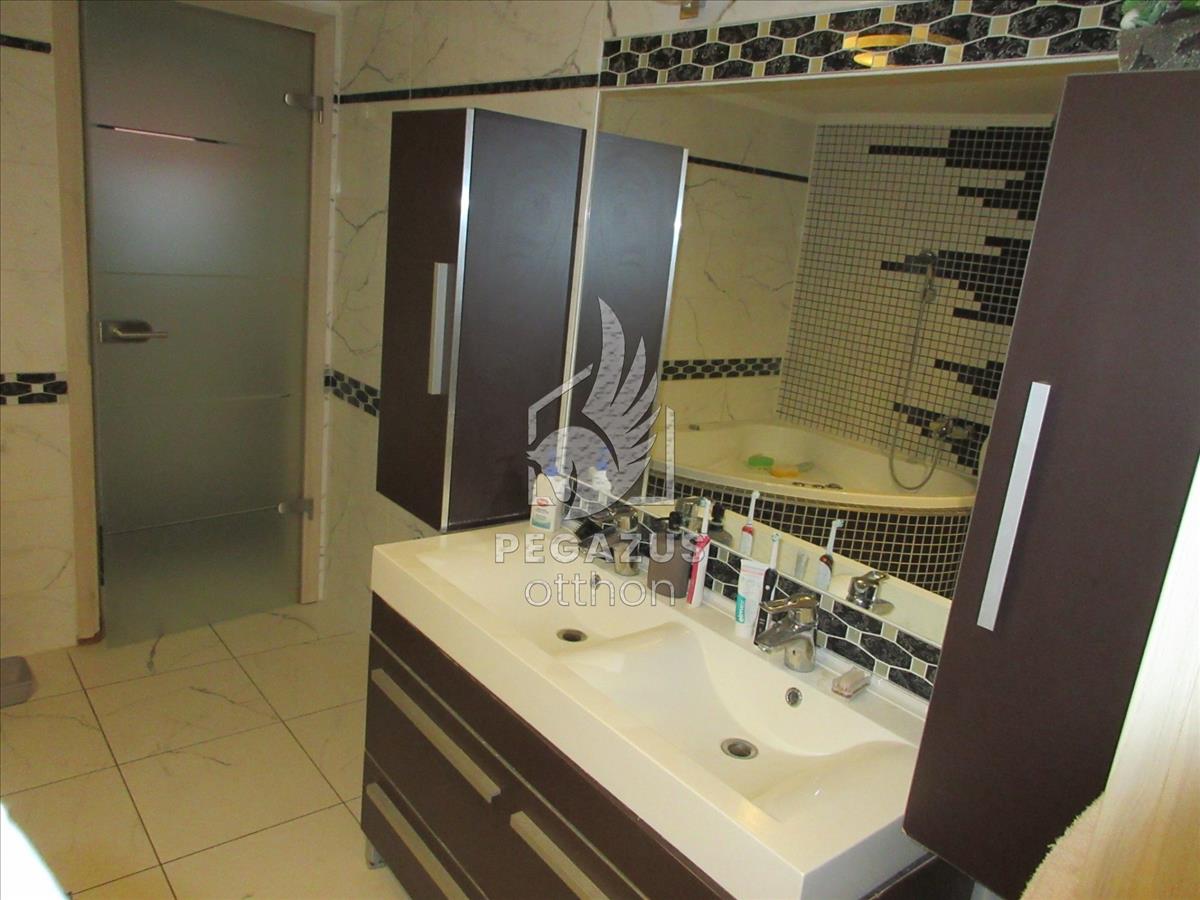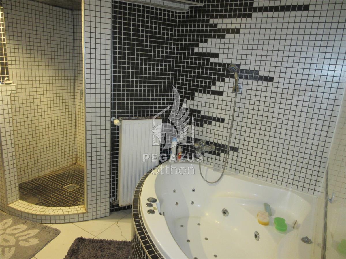 Fürdő: Kádas és zuhanyzós megoldás ikermosdóval, külön mosókonyha és toalett.
