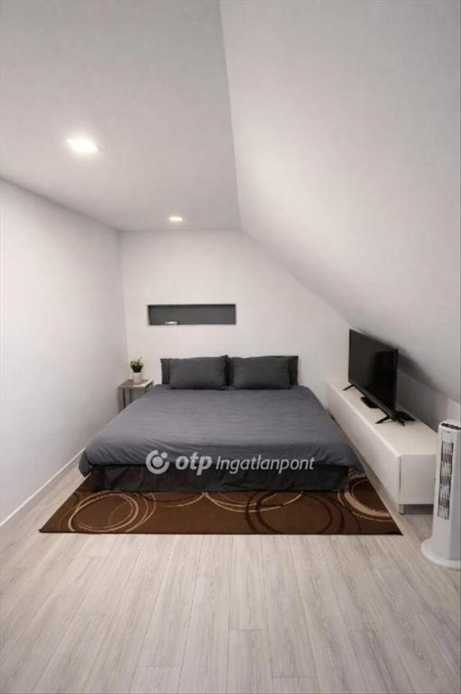Az emeleti részen egy kényelmes méretű hálószoba található, amely intim és jól szeparált pihenőteret biztosít.