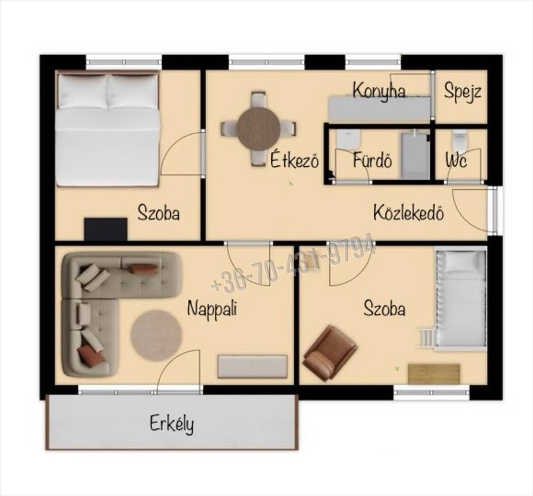 erkély), étkező, konyha, spejz, kádas fürdőszoba, külön wc és közlekedő található.
