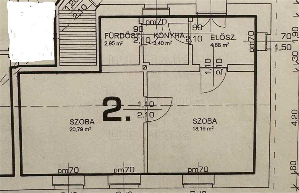 Két nagy szobával (18; 20 m2), egy konyhával, fürdőszobával és előszobával rendelkezik.