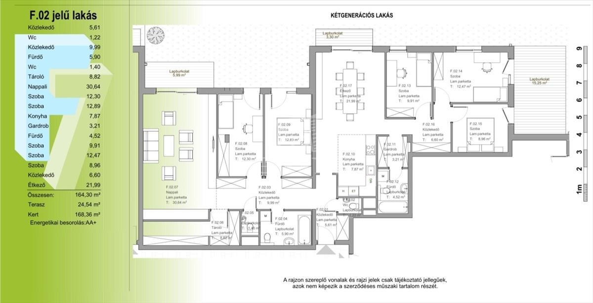 A 4 szintes (p+fszt. +Iem. +Iiem) társasház 11 db lakást tartalmaz amiből 2 db lakás kétgenerációs kialakítású. a lakások rendelkeznek kert, erkély és tetőterasz valamelyikével. Továbbá lakáson belüli / kívüli tároló lehetőséggel. Akadálymentes bejutás az épületbe.