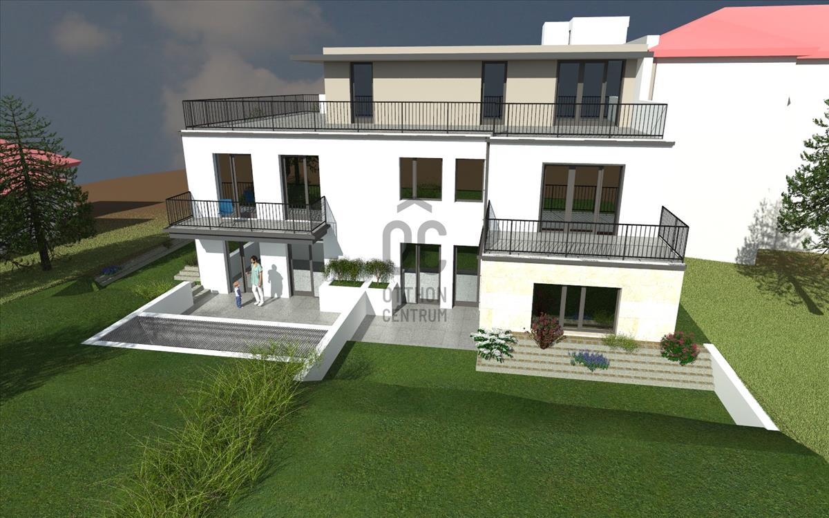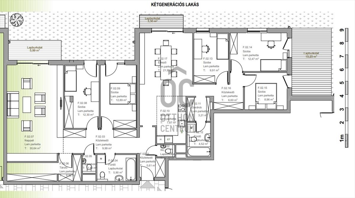 Az épület földszintjén elhelyezkedő lakás extra nagy méretű, nettó alapterülete 164, 3 nm. Elvileg két-generációs kialakítású, de a beruházó még egyedi elképzeléseket is meg tud valósítani. Akár két különálló lakás is kialakítható belőle.Összesen 24, 5 nm -en három terasza is van, amelyekre a nappaliból, étkezőből és 2 hálószobából lehet kimenni. Saját használatú kertje pedig mintegy 168 nm.