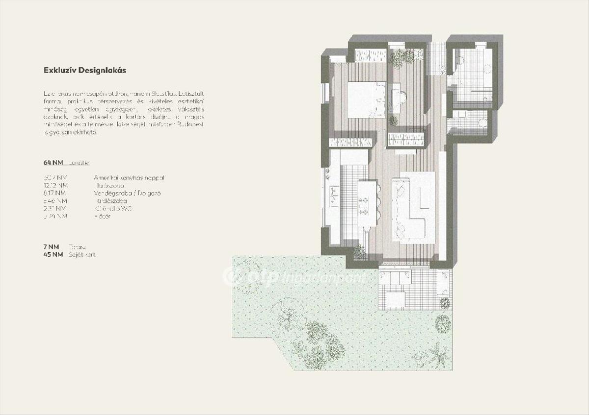64 nm lakótér + 7 nm burkolt terasz + kb. 50 Nm saját, gondozott kert + saját parkoló,