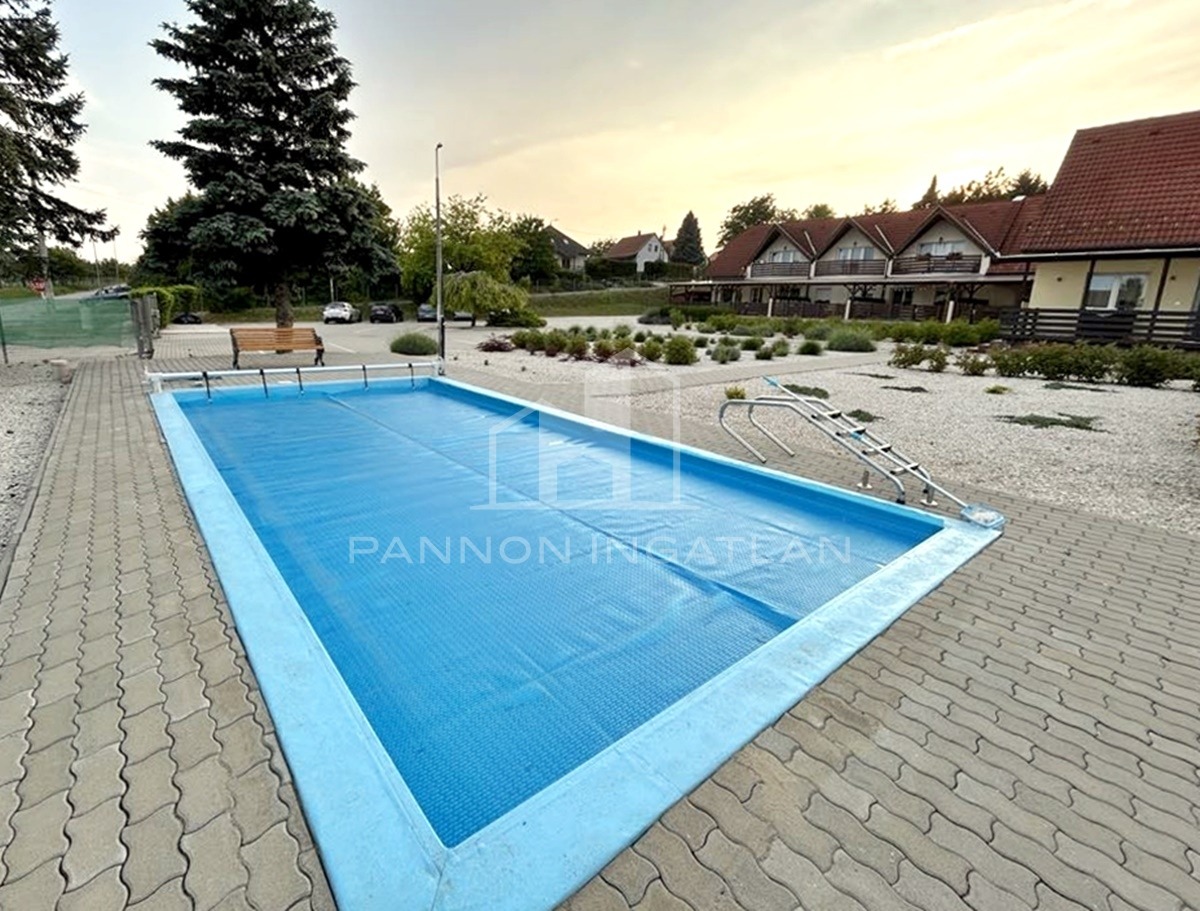 Eladó nappali+ 2 szobás szuterén szinti lakás, felsőörsi társasházban, nagy közös kerthelyiséggel, kültéri medencével és SZAUNÁVAL!