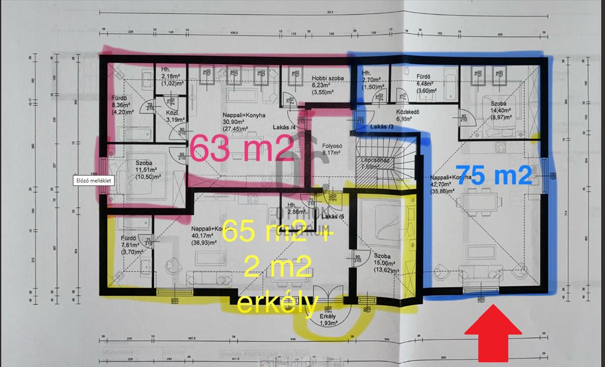 A lakás bruttó 75 m², nettó 57 m² alapterületű.