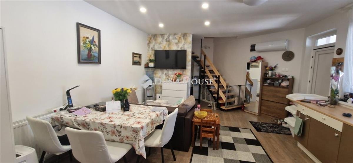 A belső kétszintes, 100 nm-es lakás elosztása: alsó szinten konyha-étkező-nappali, fürdőszoba- wc, hálószoba, az emeleti szinten, 2 hálószoba, világos, tágas nappali, fürdőszoba-wc, található. a lakáshoz egy 25 nm-es fedett terasz is tartozik. Az ingatlan 2023-ban teljeskörű felújítást végeztek. a lakásban minden közmű megtalálható.