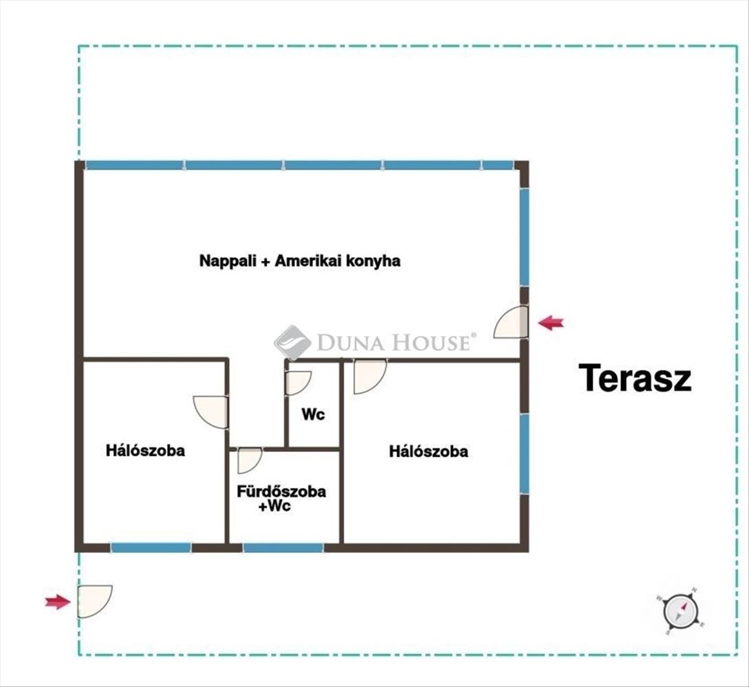 Az ingatlanban egy, a Balaton irányában teljes üvegfelülettel rendelkező, tágas, amerikai konyhás nappaliszoba, két különnyíló hálószoba, egy fürdőszoba+wc, egy külön wc, és a helyiségeket összekötő közlekedő találhatóak. a teraszra a nappaliból két irányban is kiléphetünk.