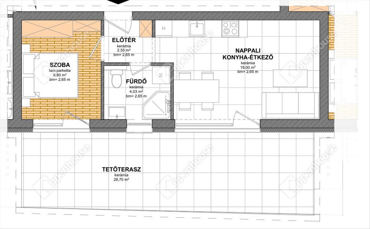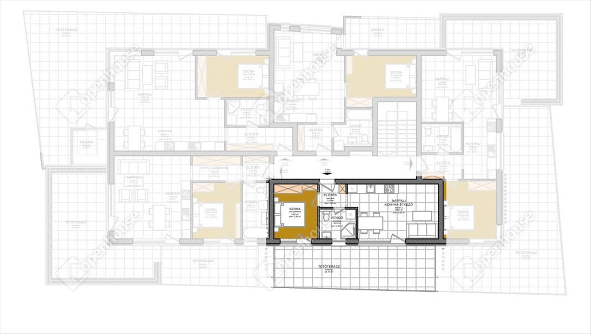 - 2. emeleti, 1 szoba + amerikai konyhás nappali, fürdő előtér elosztású