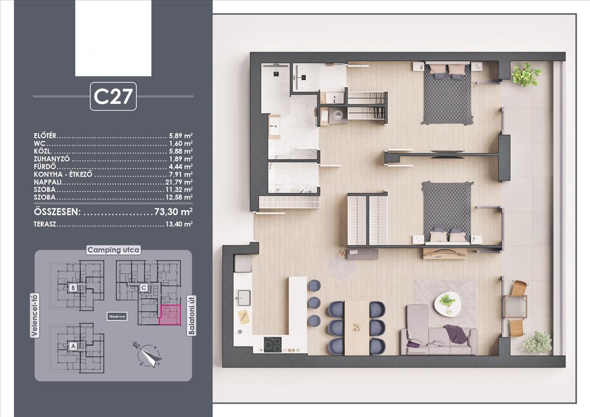 Gárdony Agárdi városrészének központjában, a Balatoni út és a Camping út határolta 3814 m2 területen, a volt Nádas étterem helyén épülő Agárd-Lux projekt társasház "c" jelű épület 2. emeletén található déli tájolású lakás. Közvetlen közelében található posta, vendéglátóhelyek és különböző kereskedelmi egységek. 200 Méterre található a vasútállomás, ahonnan vonattal könnyen elérhető Székesfehérvár és Budapest. a Velencei-tó 300 méteres távolságban van, itt a horgászat és a vízi sportok kedvelőinek lehetőségük van a tartalmas időtöltésre. Agárd távolabbi részén található a Termálfürdő, ahol a wellness mellett gyógyulási szolgáltatások is elérhetőek. a lakások modern komfort és prémium minőségűek, alapfelszereltségéhez tartoznak a helyiségenként felszerelt fűtésre optimalizált hőszivattyús klímák és az alumínium redőnyök előkészítése is. Az átadás időpontja 2025 második fele. Érdeklődés esetén időpont egyeztetése bármikor. Megtekintés munkaidőben, a jelenleg folyó kivitelezési munkálatok miatt. FIX 3% lakáshitelre megvehető