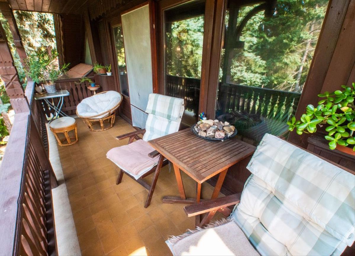 Az 1930-as években épült villaépület egy hangulatos, gondozott 2200 nm-es saroktelken található. a telekre két székelykapun keresztül jutunk be, a gépkocsik számára készült kapu távirányításos! a fákkal körbevett ház kívülről eredeti formáját megőrizte, belül viszont három önálló lakásra osztott. Ez az ingatlan a legkisebb a három lakásból, és a tetőtér kétharmadát foglalja el. a villa tetőzetét, teraszait, és lépcsőit gyönyörű famunka teszi egyedivé és kortalanná, az egész házat belengi egy erdélyi vadászház hangulata! Ebbe a lakásba egy szépen faragott falépcsőn jutunk fel, pontosabban a nyitott előtérbe és majd onnan a lakásba. a konyhából nyílik az egyik hálószoba és a folyosó, melyről nyílnak a fürdők, a másik hálószoba, és a több mint 50 nm-es nappali! Ennek erkélyéről gyönyörködhetünk a szomszéd telek ősfás fenyvesében, mely lenyúlik a Duna-partig (és szintén megvásárolható! )!Helyiségek: