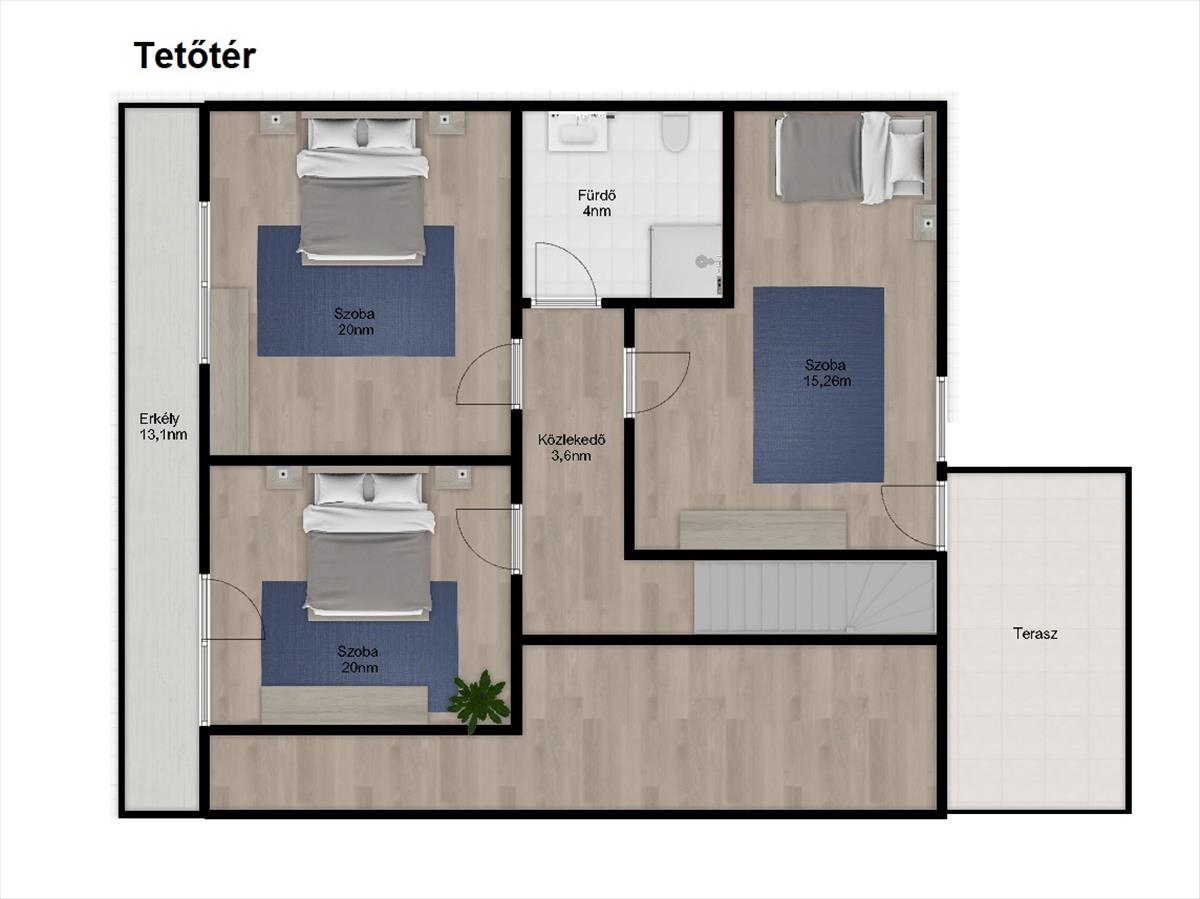 Emeleten erkélyes nappali, étkező, konyha, kamra, egy szoba, kádas fürdőszoba, tároló lett kialakítva. Tetőtérben 3 szoba, közlekedő, egy zuhanyzós fürdőszoba és nagy erkély található.