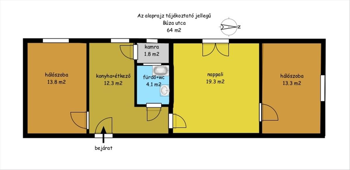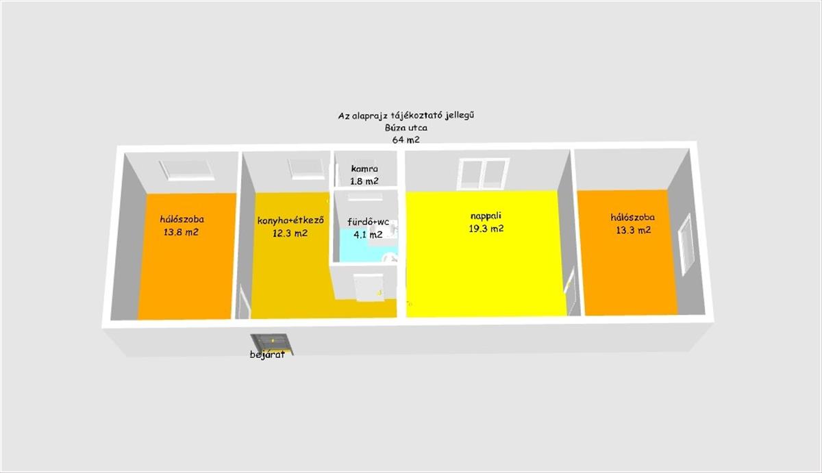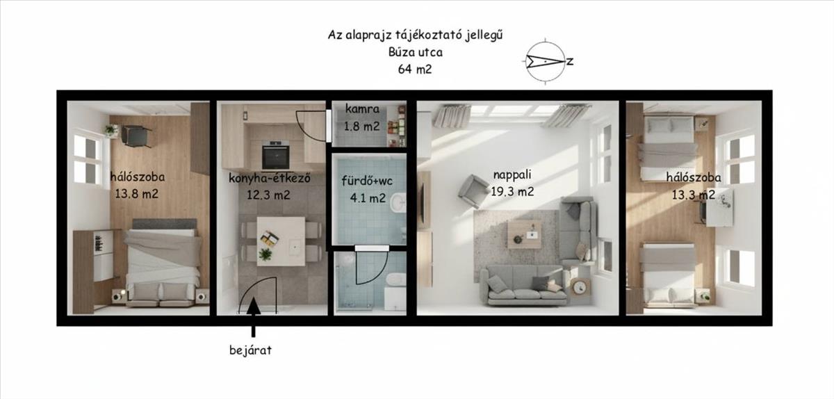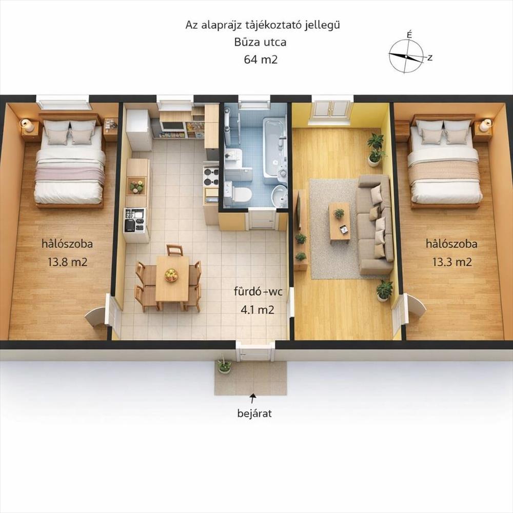 A 64 m2-es lakás elosztása ideális, a nappali, és a kettő szoba tágas és jól berendezhető életteret biztosít.