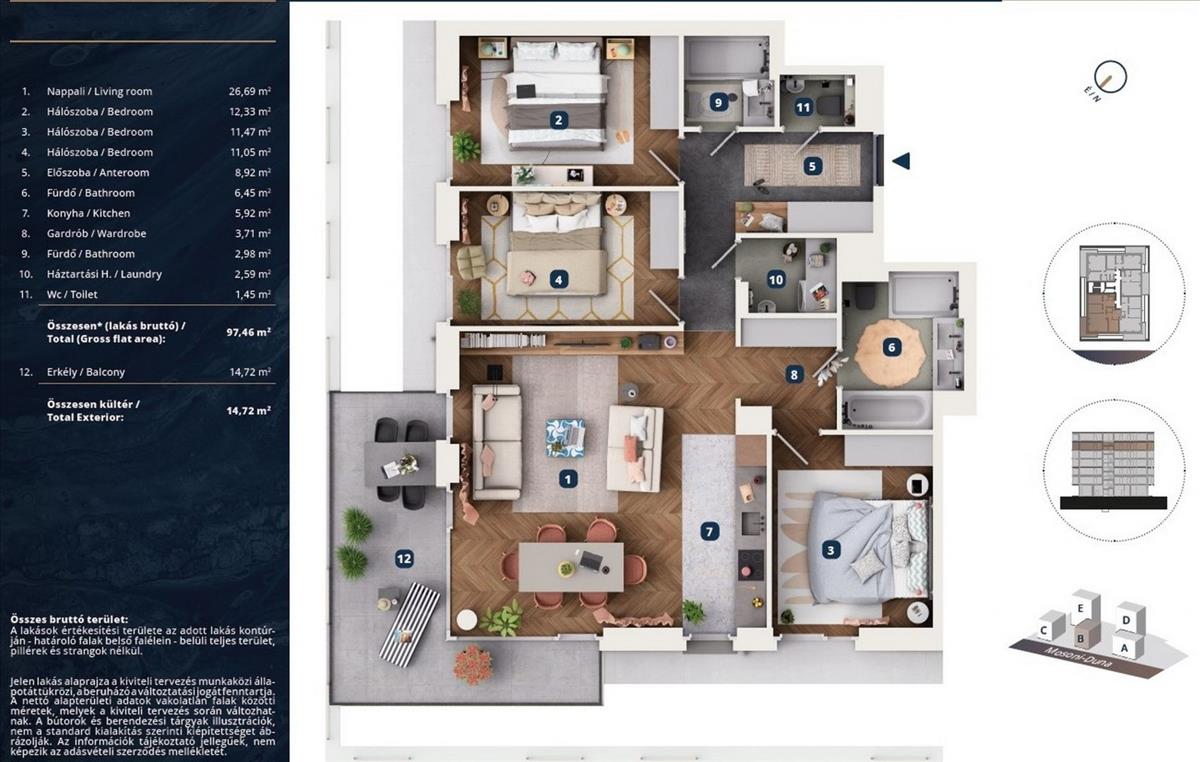• 97, 46 m² alapterület („nettó” 93, 56 m2, „bruttó” 97, 46 m2 alapterületű)