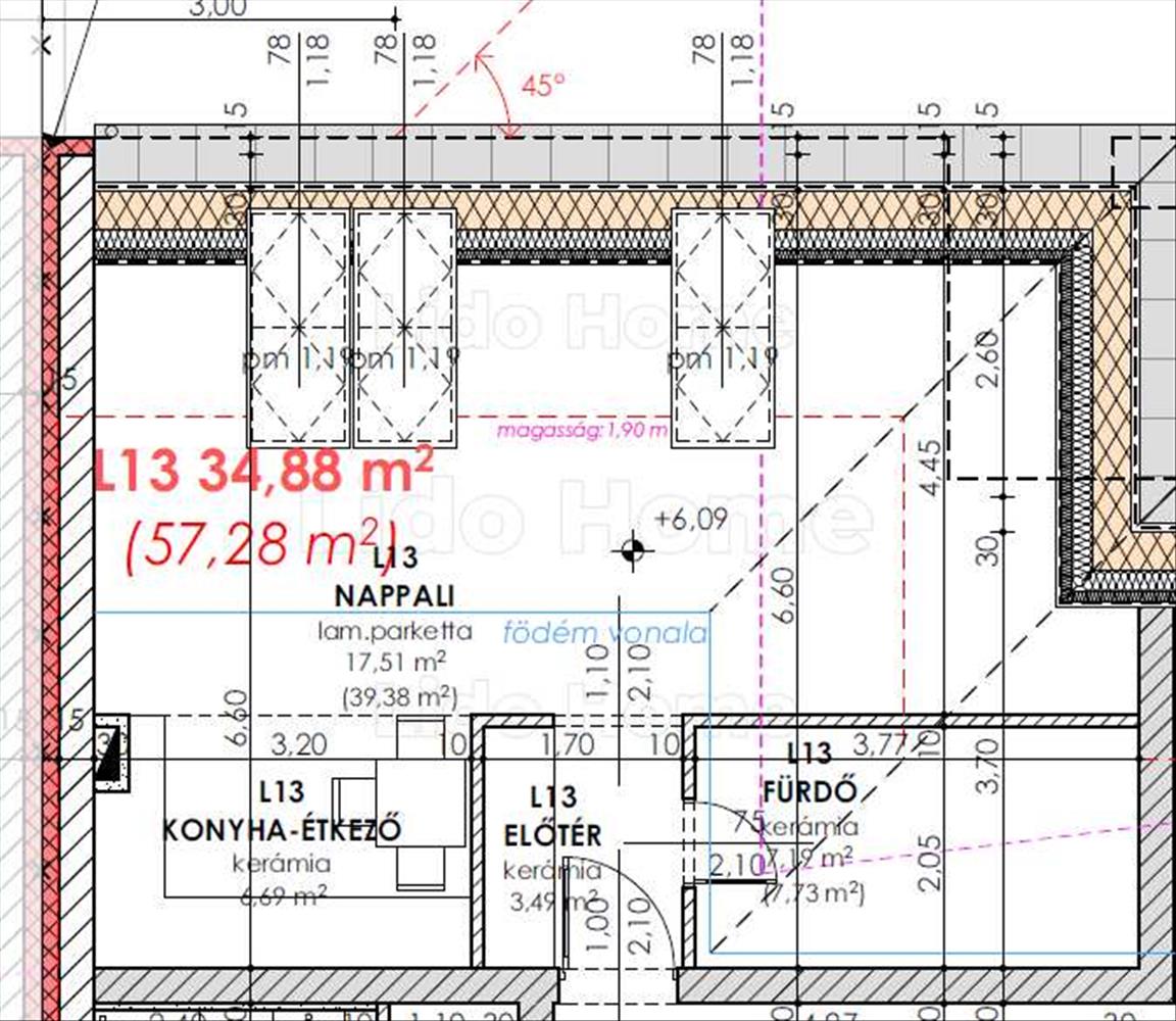 - 57, 28 m2 bruttó, 34, 88 nettó alapterületű tetőtéri lakás