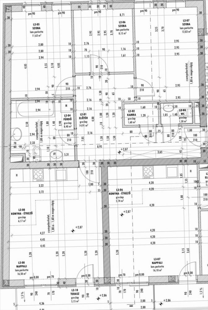 - fürdőszoba (8, 4m2) káddal, zuhanyzóval és épített mosdóval