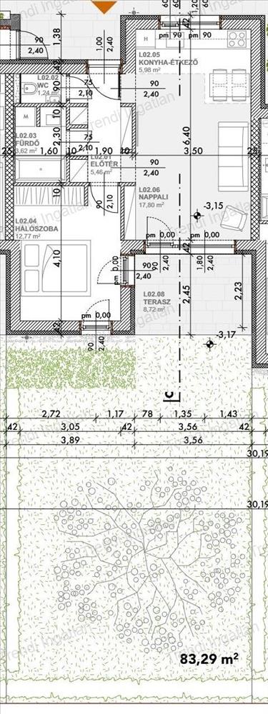 A meghirdetett földszinten található 46, 87 nm -es lakásban amerikai konyhás nappali, szoba, fürdőszoba és előtér található. Nappaliból 8, 72 nm -es terasz és 83, 29 nm -es kertkapcsolat nyílik.