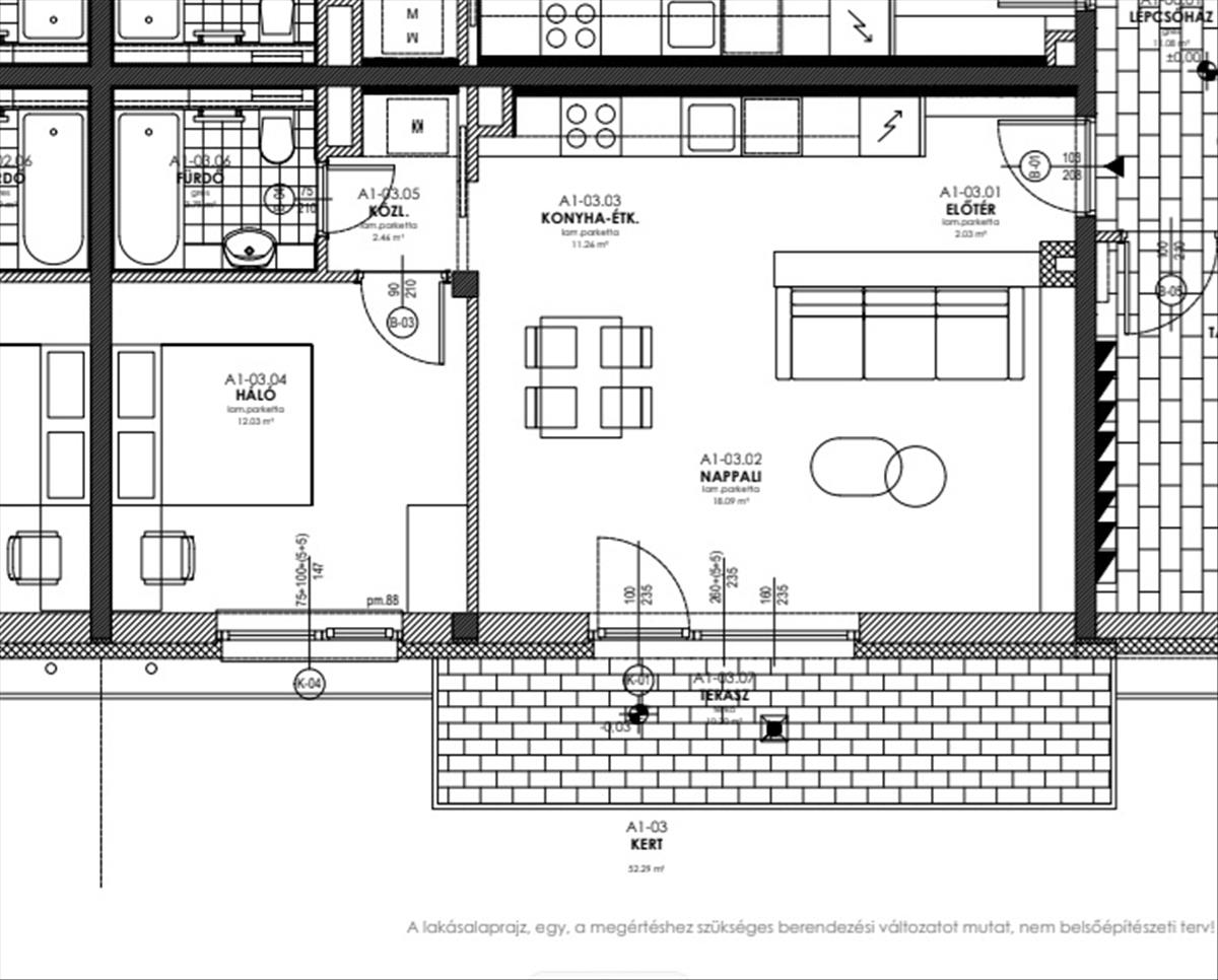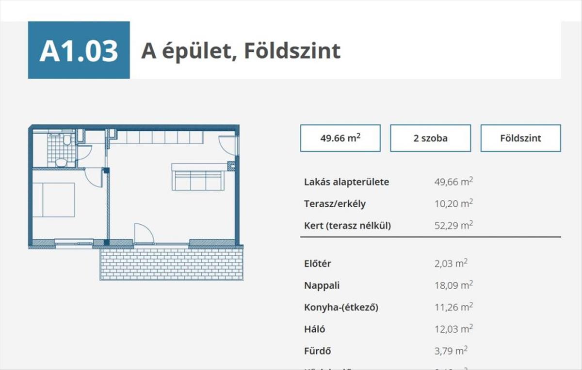 Az a103 jelű lakás a földszinten található, 49, 66 nm + 10, 20 nm terasz alapterületű, melyhez 52, 29 nm saját használatú kert kapcsolódik.