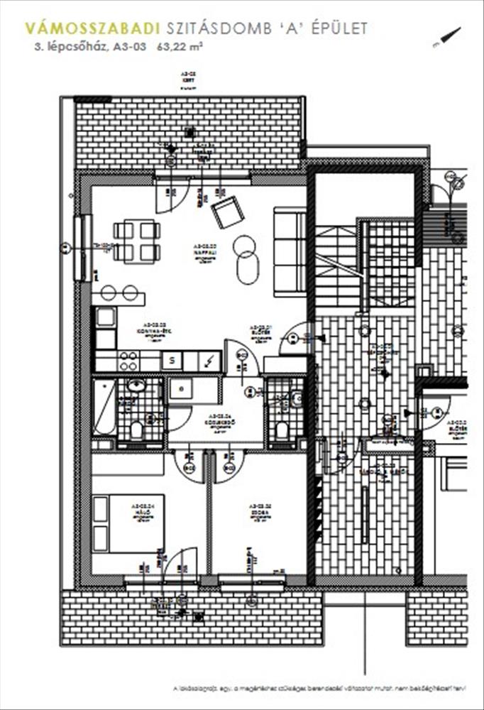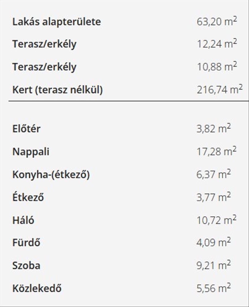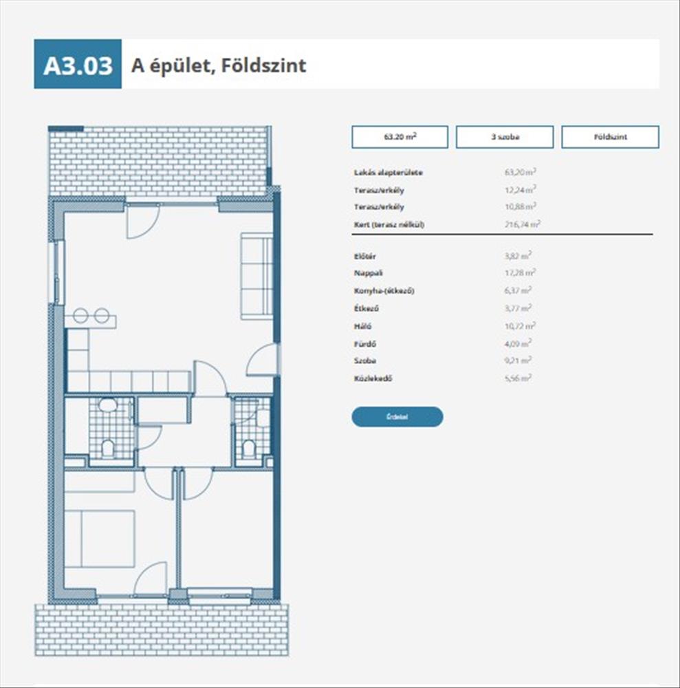 Elrendezése: előtér (3, 58 nm ), amerikai konyhás nappali étkezővel (27, 06 nm ), közlekedő (5, 23 nm ), fürdőszoba wc-vel (3, 76 nm ), wc (2, 09 nm ), háló (10, 72 nm ), háló (8, 88 nm )
