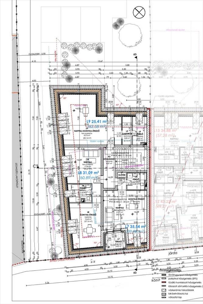 Tetőtéri l7 lakás bruttó 39, 98 m2 (nettó 35, 54 m2 ) helyiségei: amerikai konyhás nappali, fürdő WC-vel, előszoba, háztartási helyiség WC-vel, közlekedő. Erkély 5, 32 m2