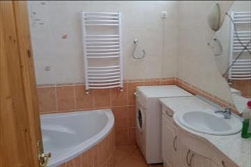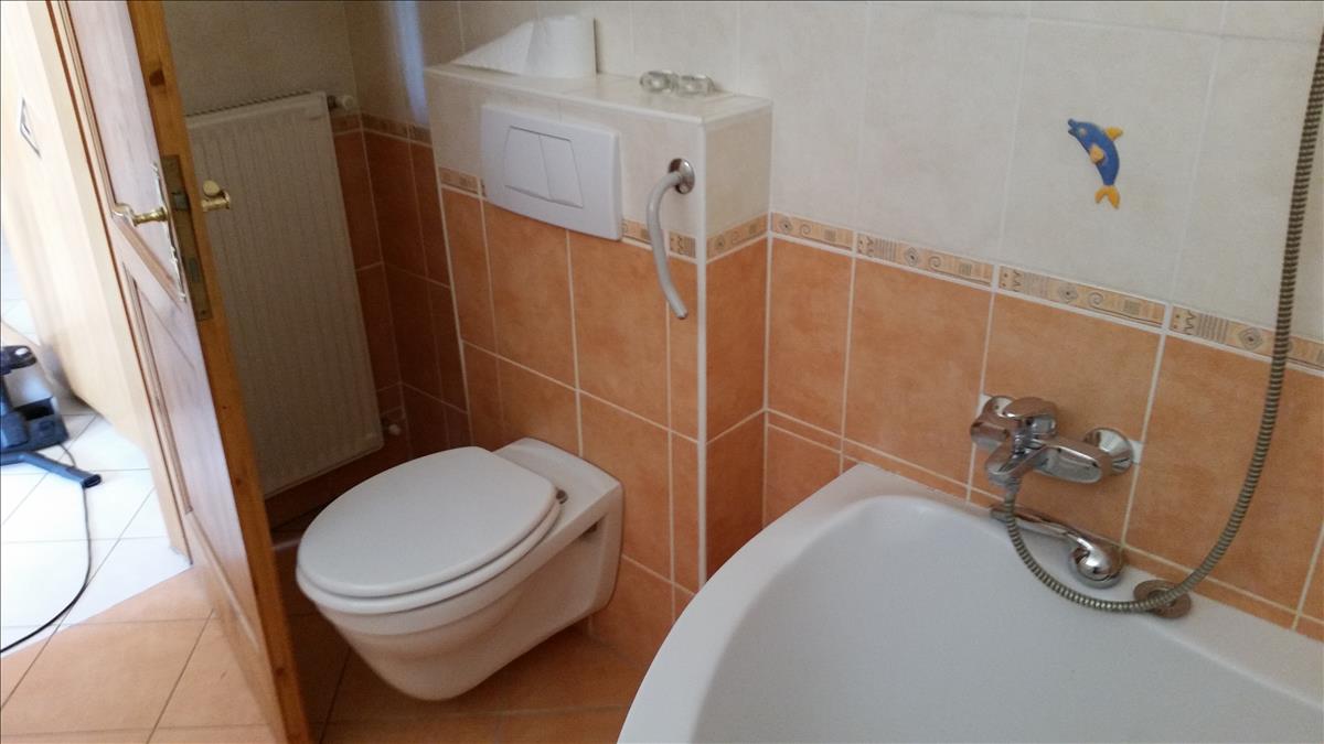 A fürdőszoba és a wc egy helyiségben található, ízlésesen kialakított, igényes burkolatokkal.