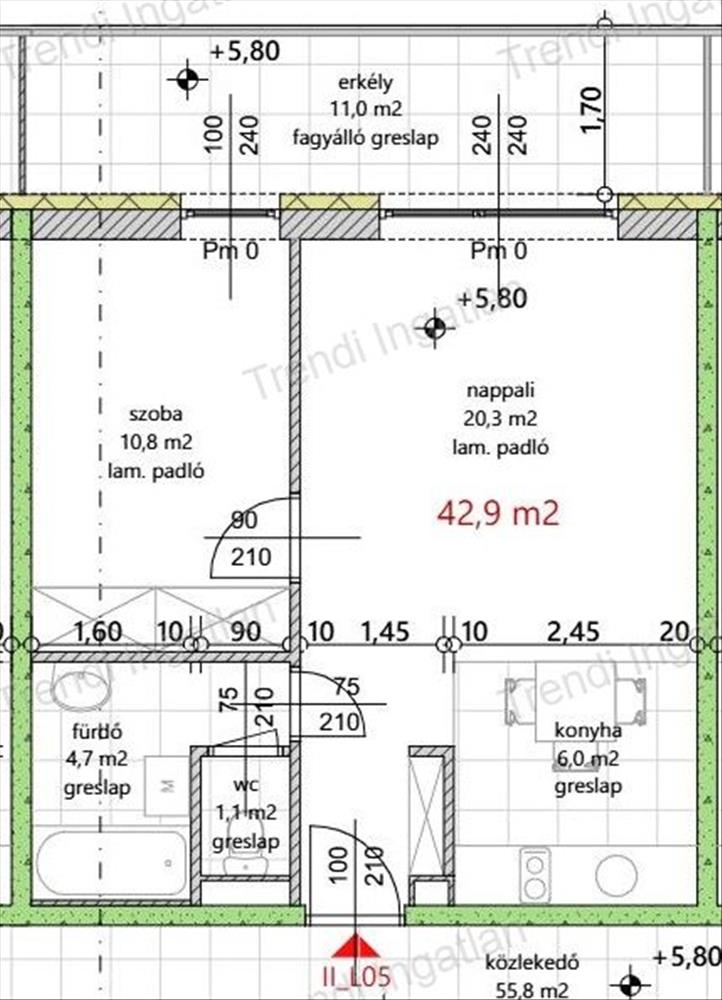 A meghirdetett 2. emeleten található 42, 90 nm-es lakásban amerikai konyhás nappali, szoba, fürdőszoba, külön wc, előtér kerül kialakításra. Nappaliból 11 nm-es erkély nyílik.