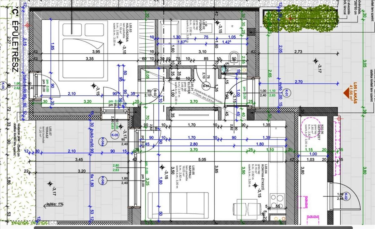 A földszinti 39, 98 m2-es l05 lakás helyiségei: