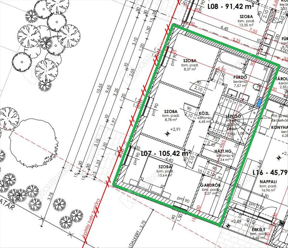 L7 számú lakás: földszinti 105, 42 m2 alapterületű, 4 szoba nappali elrendezésű, 11, 2 m2 terasszal.