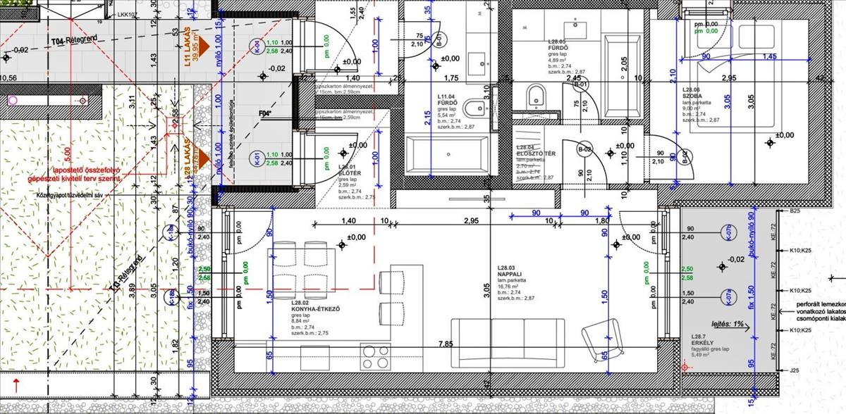 A földszinti 44, 78 m2-es l28 lakás helyiségei: