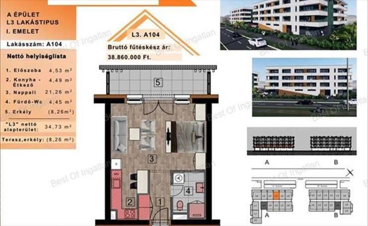 A hirdetésben szereplő l3. Típusú, 1. emeleti, D-K-i fekvésű, erkélyes lakás 34, 73 m2 + 8, 26 m2 erkély