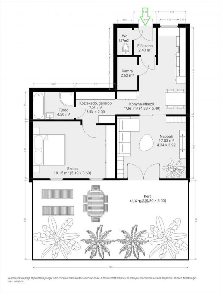 Nettó 71 m2-es, lakás megnevezésű ingatlanhoz, 8, 14 négyzetméter nagyságú tároló és 15, 57 négyzetméter nagyságú gépkocsibeálló tartozik, valamint a Társasházi Alapítóokirat szerinti 45, 37 m2-es előkert kizárólagos birtoklásának és használatának joga.