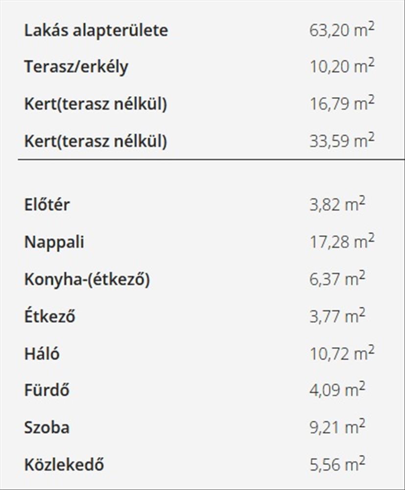 A nappalihoz 11, 68 nm -es terasz és 16, 79 nm saját kert, a két hálóhoz pedig 10, 27 nm -es terasz, valamint 33, 59 nm saját kert kapcsolódik.