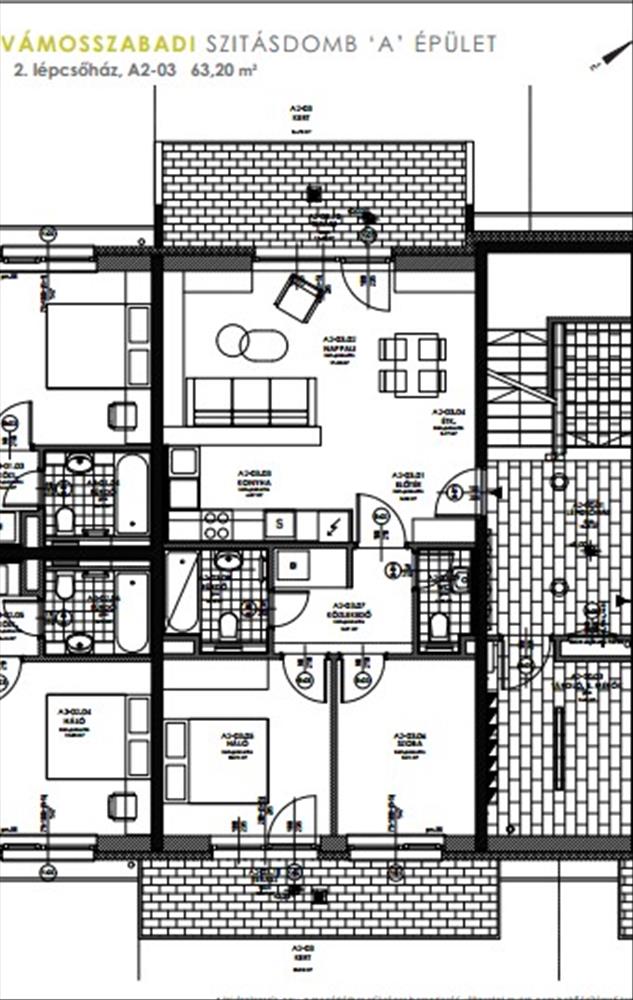 Az a203 jelű lakás a földszinten található, 63, 2 nm + 21, 95 nm terasz alapterületű, melyhez 50, 38 nm saját használatú kert tartozik.