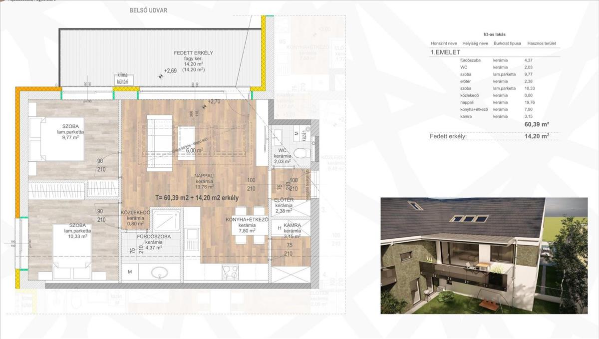 Földszinti lakás: 60. 39 M² + 14, 20 m² Fedett erkély