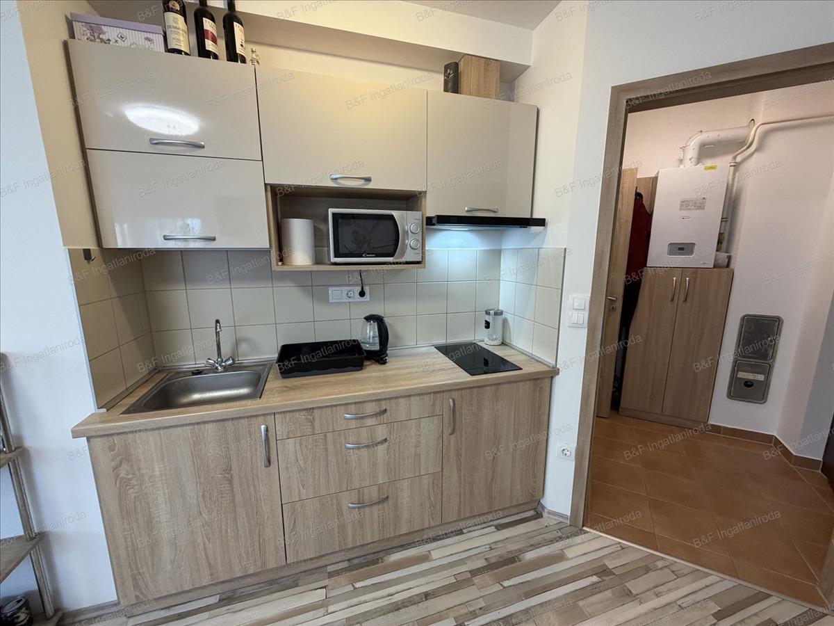 A lakásban található egy nagy amerikai konyhás nappali, 1 szoba, fürdő-WC, előtér és egy a nappaliból nyíló terasz.