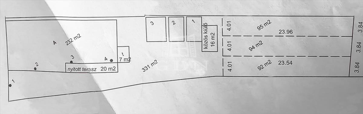 Az ingatlan egy nagy családi ház felújításával együtt lett 3 db lakássá felosztva (ügyvédi megosztással), minek keretén belül minden lakáshoz tartozik egy fedett lemezgarázs (helyszínrajzon 3-mas) illetve egy 100 nm -körüli telekrész is.