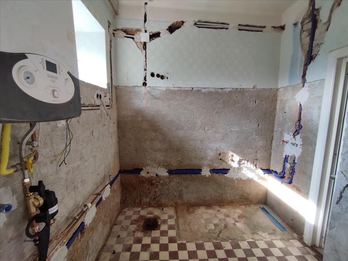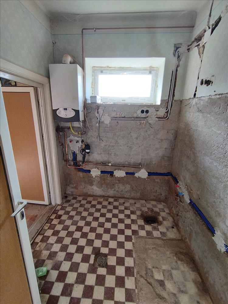 Az épületben két világos szoba, egy nappali/étkező, konyha, fürdőszoba és külön wc található. a házhoz csatlakozik több tároló, pince, garázs. Locsolást fúrt kút teszi lehetővé. a felújítás elkezdődött, a villany- és vízvezetékek cseréje megtörtént, illetve 2 nyílászáró korszerűsítve lett. a gázkazán is át lett nézve. Az új tulajdonosnak a villanyóra bővítése, burkolás, festés és szerelvényezés van hátra a belső munkálatokból.