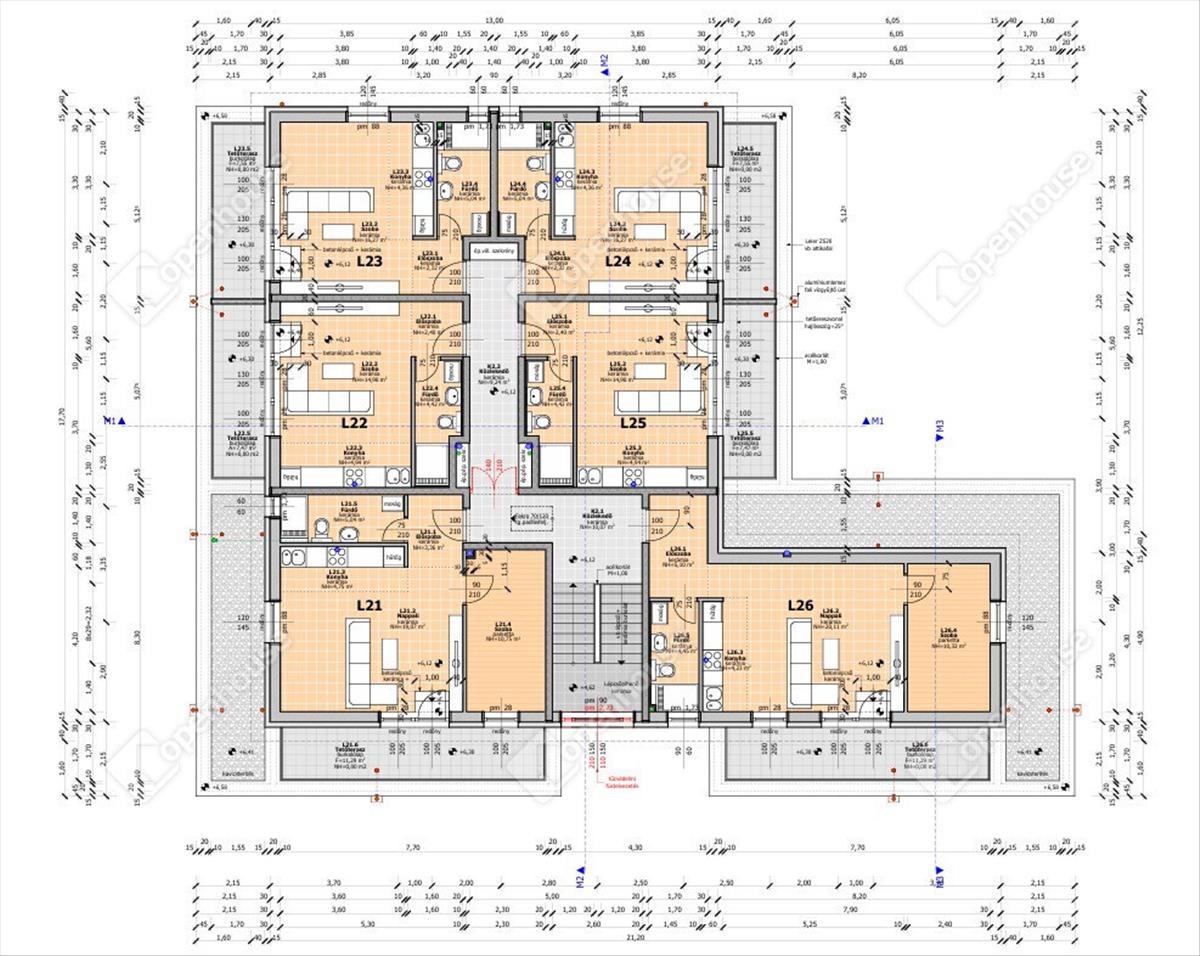 Szerkezeti jellemzők: Az épület főfalai alatt vasbeton sávalapok, a pillérek alatt beton pontalapok készülnek a statikai tervekben meghatározott acél és betonminőségekkel. a külső főfalak pth30 n+f Rapid Dryfix (vagy ezzel egyenértékű) égetett agyag falazóelemekből készülnek. a lakások közötti belső főfalak lkf20 Leier vasbeton kéregfalak, melyek a statikai tervekben meghatározott minőségű betonnal kerülnek a helyszínen kibetonozásra. a belső válaszfalak pth10 n+f Rapid Dryfix égetett agyag falazóelemekből készülnek. a tervezett födémek monolit vasbeton lemezfödémek 20 cm szerkezeti vastagsággal. Az erkélyek konzolos szerkezetei Schöck Isokorb hőhídmegszakító elemekkel kapcsolódnak a födémlemezekhez.