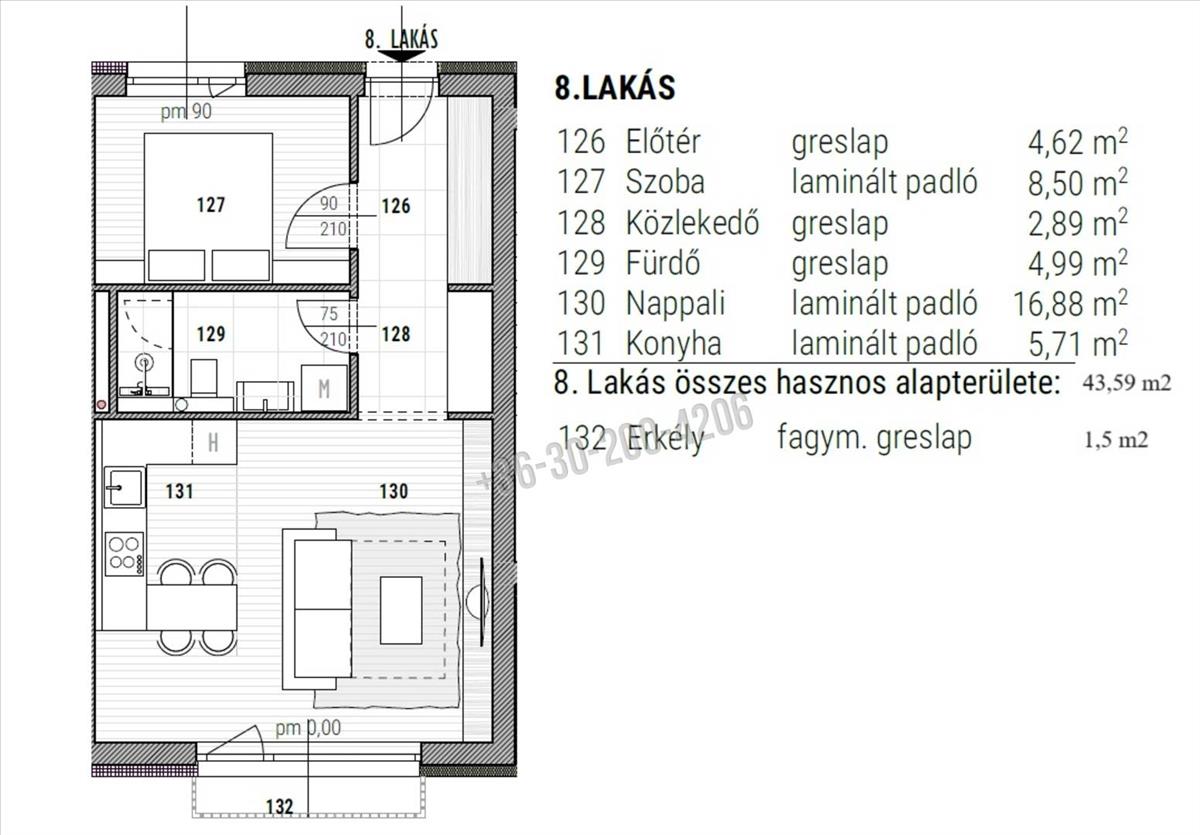 A jelen hirdetésben szereplő ingatlan első emeleti, 43, 59 m2 alapterületű és a hozzá tartozó erkély mérete pedig 1, 5 m2. Elrendezését tekintve egy amerikai konyhás nappalival, egy külön hálószobával, előszobával és egy fürdőszoba WC-vel rendelkezik.