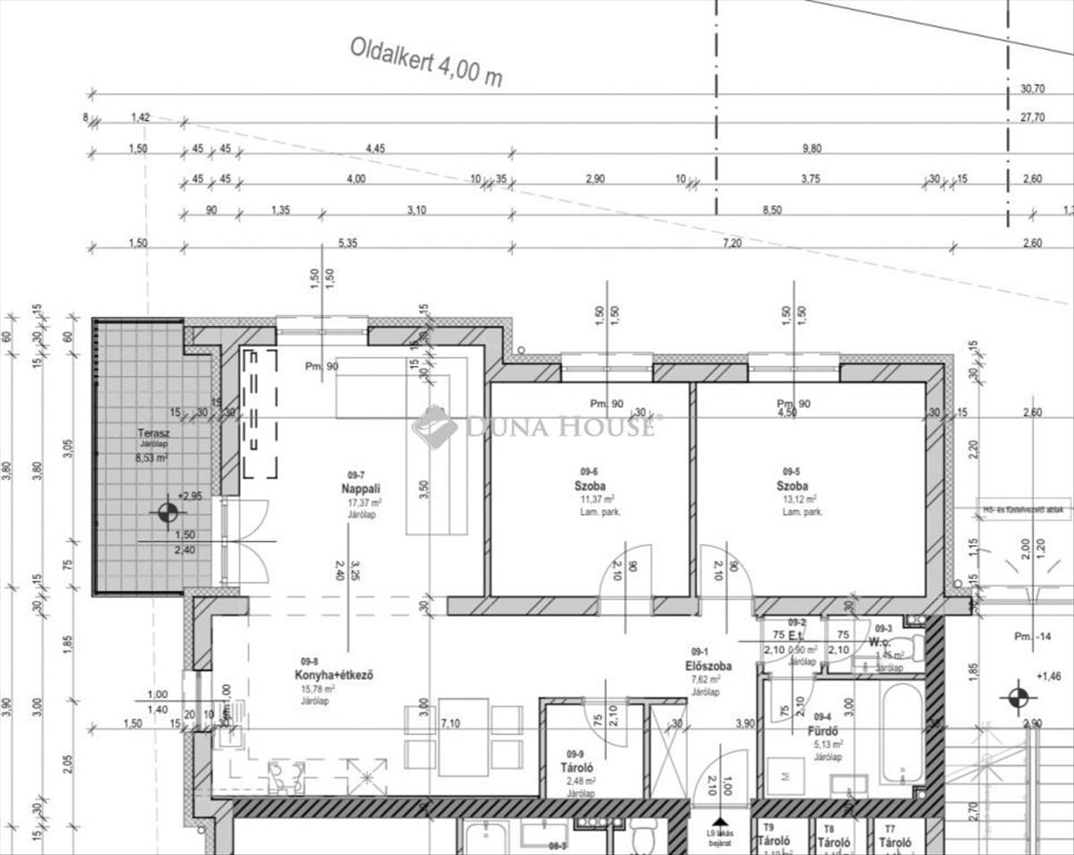 Legfontosabb műszaki jellemzők; Falazat: Külső főfalak: 30 cm-es Leier n+f falazóelem, falazóhabarccsal vagy ragasztóhabbal; Lakáselválasztó falak: Leiertherm 25/30 aku md hanggátló téglafal; Nyílászárók: Műanyag, legalább 5 kamrás, 82 mm-es, 3 rétegű üvegezés; Kiváló hő- és hangszigetelés, redőny előkészítés minden nyílászárónál (vakolt rejtett redőnytokok, elektromos kiállással); Fűtés-hűtés:Fűtésről energiatakarékos hőszivattyús padlófűtés, hűtésről fan-coil rendszer gondoskodik, helyiségenként szabályozva. Burkolatok: Vevő által választható, i. Osztályú hideg- és melegburkolatok, ár kerettel; Fürdőszobákban minőségi szaniterek, ravak zuhanykabin vagy kád; Homlokzati szigetelés: 15 cm vastag eps hőszigetelés, nemesvakolat befejezéssel; Tetőfedés: Antracit színű betoncserép, korszerű víz- és páraelvezetéssel; Hang- és hőszigetelés:Valamennyi födém, válaszfal és nyílászáró kialakítása megfelel a korszerű épületenergetikai előírásoknak. Zárt, biztonságos, parkosított udvar - Saját gépkocsi-beálló - Minden lakáshoz külön tároló, mely benne van az árban - Modern hűtés-fűtés - Választható burkolatok és szaniterek -Kiváló hang- és hőszigetelés Ideális saját részre és befektetésnek is!