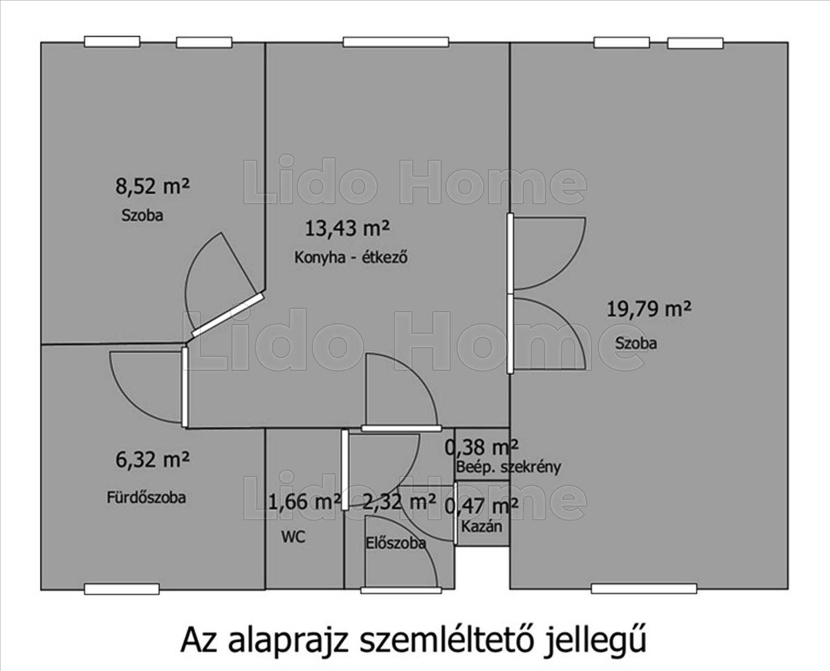 - előtér, konyha – étkező, beépített szekrény, 2 hálószoba, fürdőszoba káddal, külön wc