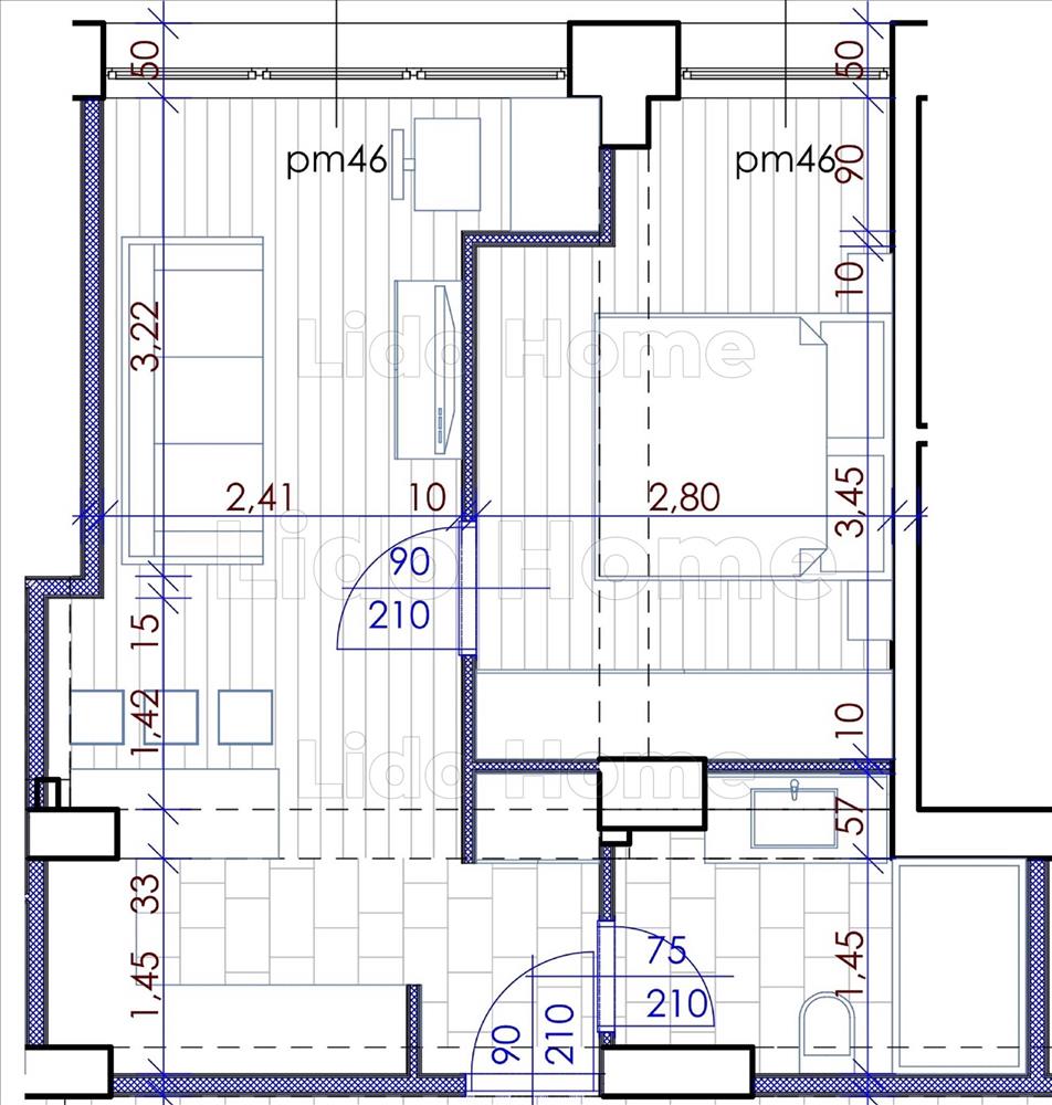 35, 49 m2 területű lakás helyiségei: amerikai konyhás nappali, hálószoba, fürdőszoba WC-vel, közlekedő.