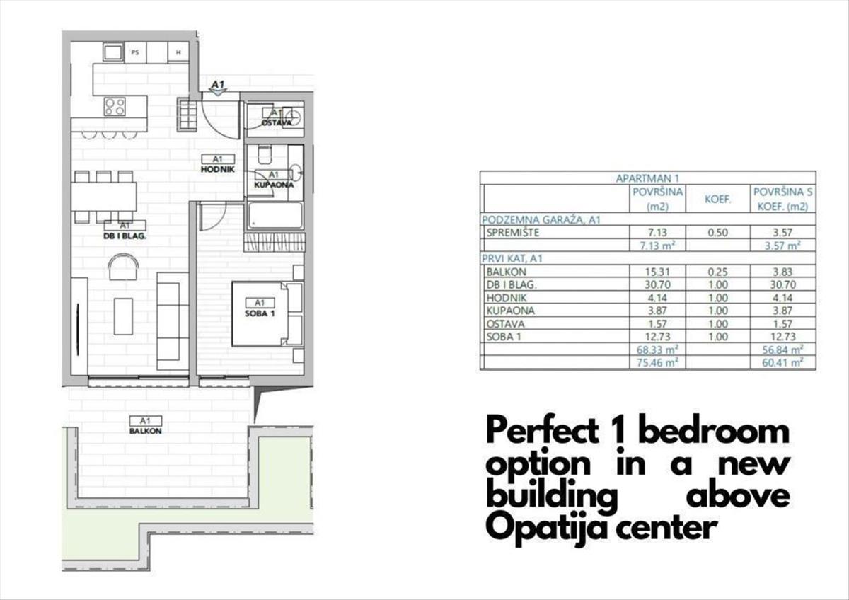Exkluzív apartman a1, 61m2 alapterületű, 31m2 nappali + konyha + étkező (nyitott tér), előszoba, öltöző, fürdőszoba, hálószoba és egy 15 m2-es erkély panorámás kilátással a tengerre és a központ háztetőire. Opatija. a projekt 1700 m2-es telken épül, és egy nagy mélygarázst foglal magában, amelyből a lakáshoz egy garázshely és egy nagy tárolóhelyiség tartozik.