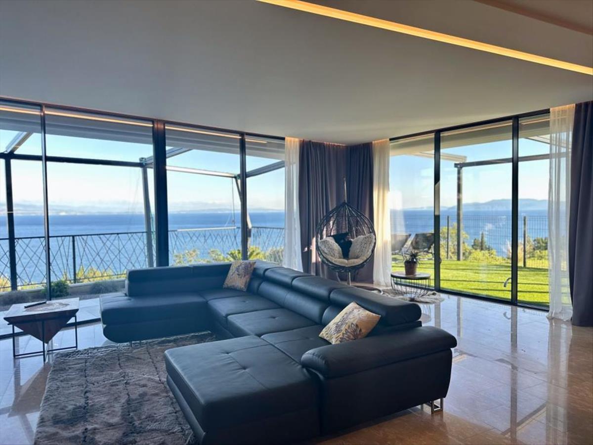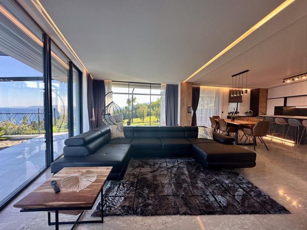 A teret fény világítja meg a nagy csúszószikláknak köszönhetően, amelyekből természetesen nyílik a kilátás a tengerre. a modern konyha impozáns 9 méteres, nagy szigettel és minden hozzá tartozó géppel, a nappaliban pedig modern bútorok teszik lehetővé a nagy összejöveteleket. Az egész tér luxust áraszt olyan gyönyörű, kifinomult anyagokkal, mint az értékes "Nero Portoro" és a "Royal" kő, amelyet a konyhában és a fürdőszobákban padló- és falburkolatokra használtak.