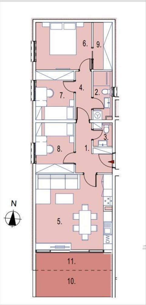 Található benne előszoba, 2 fürdőszoba, wc, mosókonyha, előszoba, konyha étkezővel és nappalival, 3 hálószoba, 2 gardrób, 2 erkély, 2 tágas loggia.