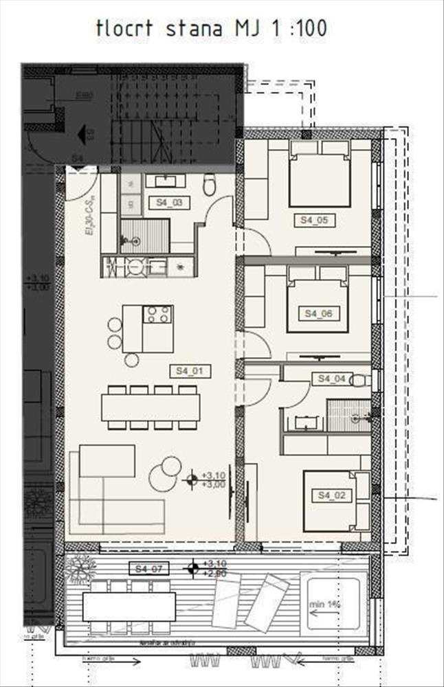s4 (126, 98 m²) : Nappali, konyha és étkező, 3 hálószoba, 2 fürdőszoba, loggia, tároló, garázs, szabadtéri parkoló. Ár: 590 000 €