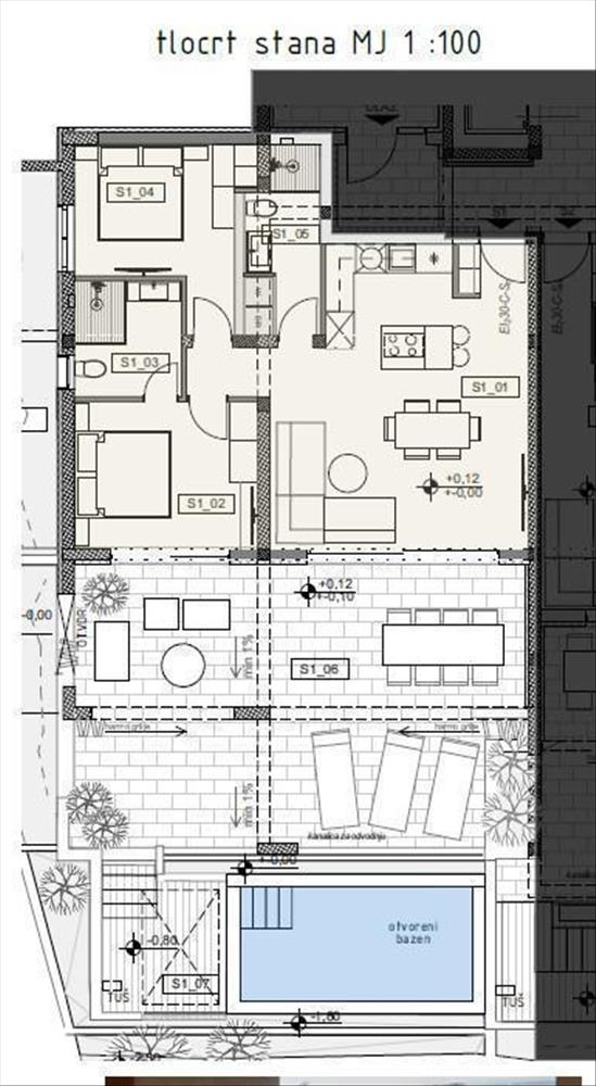 s1 (132, 25 m²) : Nappali, konyha és étkező, 2 hálószoba, 2 fürdőszoba, loggia, terasz medencével, kert, tároló, garázs, szabadtéri parkoló. Ára: 530 000 euró