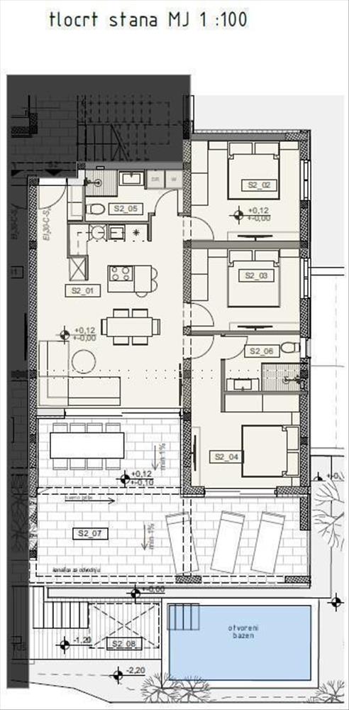 s2 (138, 19 m²) : Nappali, konyha és étkező, 3 hálószoba, 2 fürdőszoba, loggia, terasz medencével, kert, tároló, garázs, szabadtéri parkoló. Ár: 560 000 €