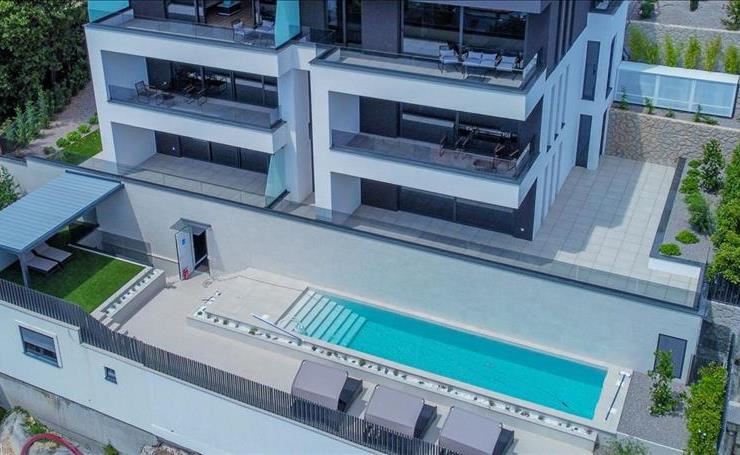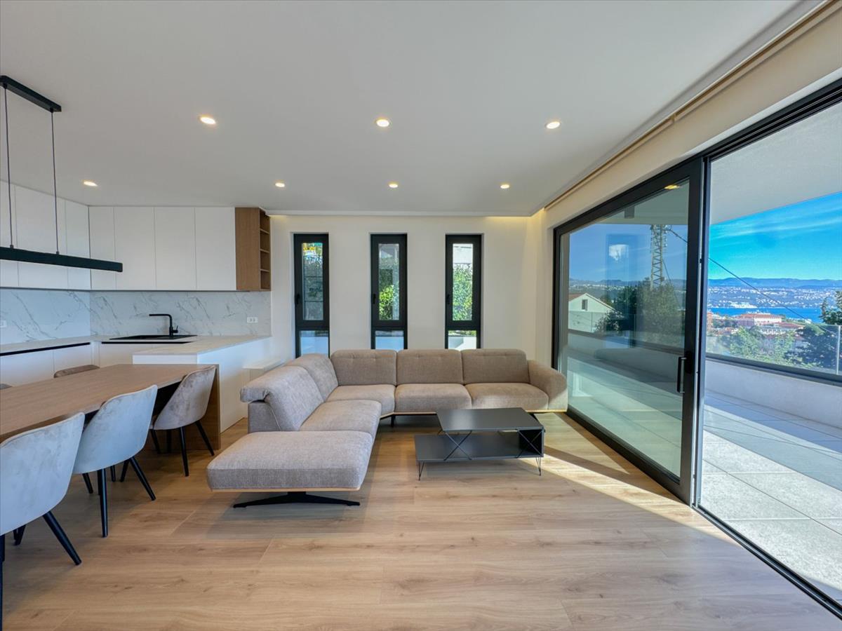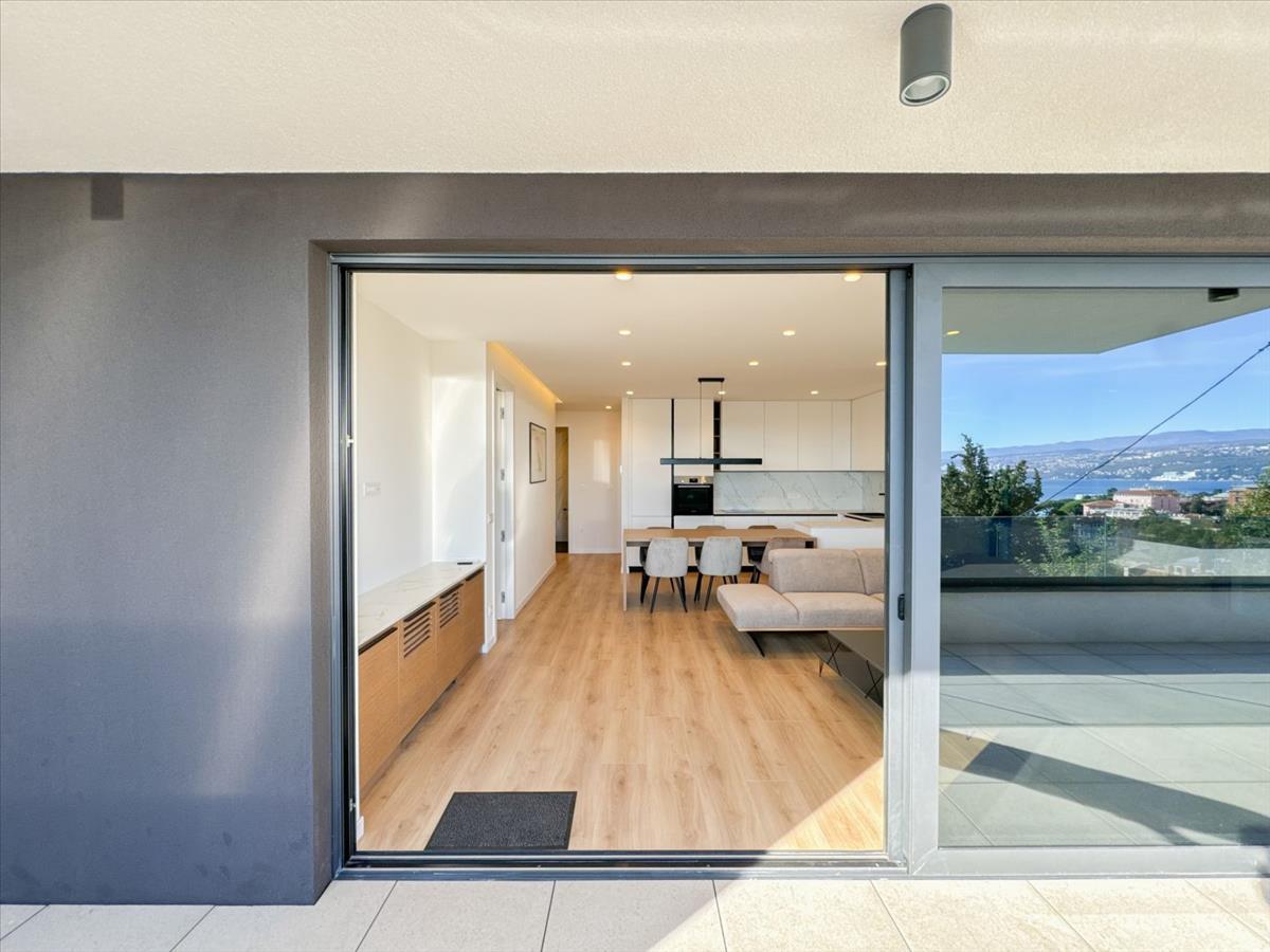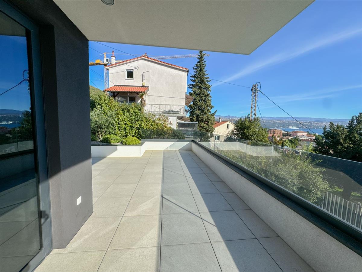 Opatija Center – 139 m²-es apartman egy új épületben, kerttel, medencével, garázzsal és kilátással a tengerre