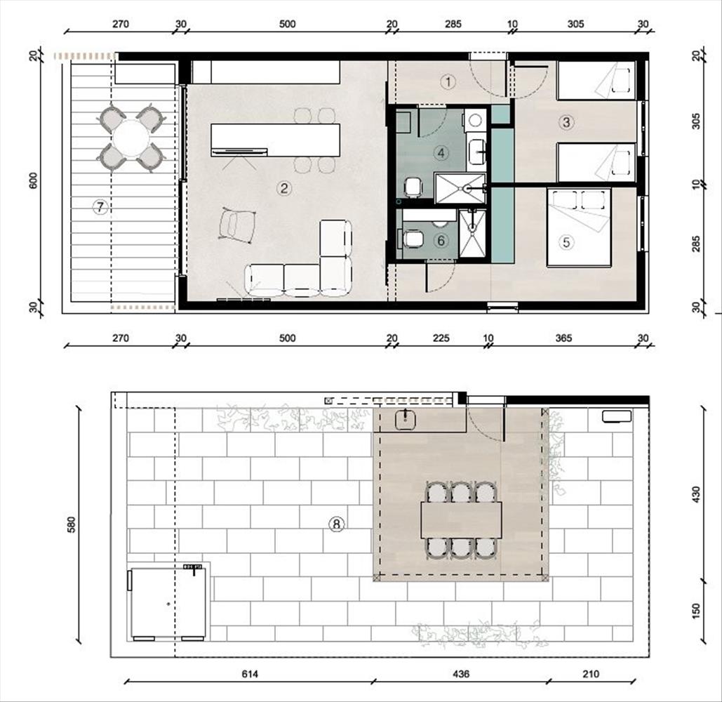 S2, földszint: 77 m², két hálószoba, terasz, tetőterasz. €454, 300